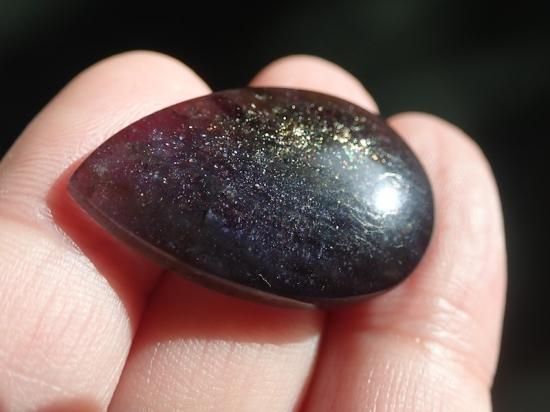 深いすみれ色のアイオライトの中にゲーサイトやヘマタイト、レピドクロサイトなどの内包物が入り混じることで、まるで宇宙のような輝きを放つアイオライトサンストーン。