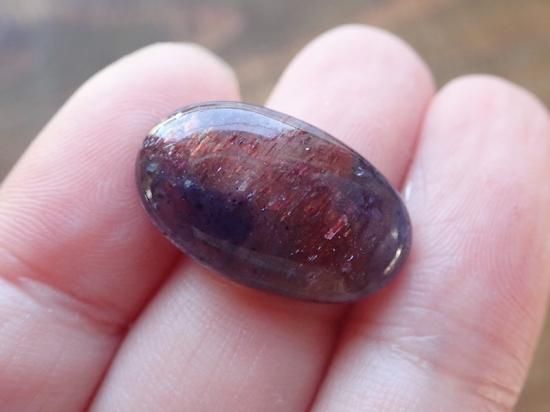 深いすみれ色のアイオライトの中にゲーサイトやヘマタイト、レピドクロサイトなどの内包物が入り混じることで、まるで宇宙のような輝きを放つアイオライトサンストーン。