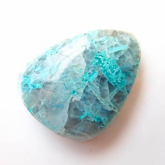 クリソコラをベースにアズライト、シャッタカイト、マラカイト、アズライト、ダイオプテーズなど実にさまざまな種類の鉱物が含まれています。もともとのベースが青や水色の石に、それらが混ざりあって石英化しているため、透明感を感じられる美しい癒しの雰囲気を感じられます。