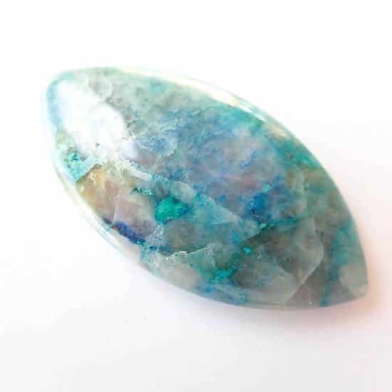 クリソコラをベースにアズライト、シャッタカイト、マラカイト、アズライト、ダイオプテーズなど実にさまざまな種類の鉱物が含まれています。もともとのベースが青や水色の石に、それらが混ざりあって石英化しているため、透明感を感じられる美しい癒しの雰囲気を感じられます。