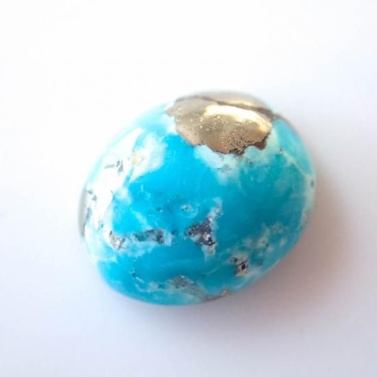 鮮やかな水色に散りばめられたパイライトの自然美が大変美しい、イラン産ターコイズになります。