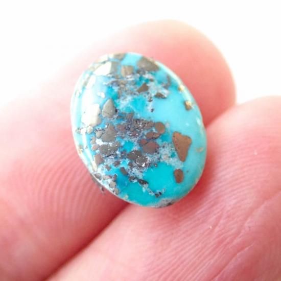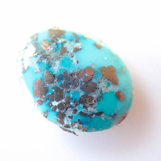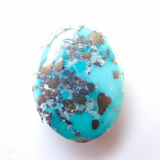 鮮やかな水色に散りばめられたパイライトの自然美が大変美しい、イラン産ターコイズになります。