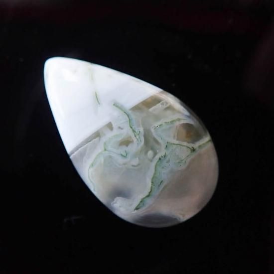 透明感のある乳白色と白色のコントラストの中に、植物のような模様が入ったツリーアゲートのルースです。