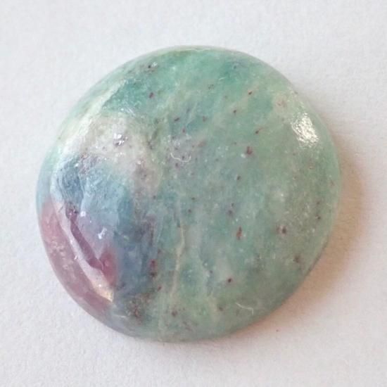 こちらは優しい緑色のフックサイトの中にルビーの結晶が入っているルビーインフックサイトのカボションカットルースとなります。
