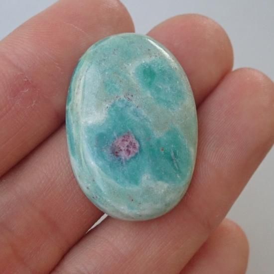 こちらは優しい緑色のフックサイトの中にルビーの結晶が入っているルビーインフックサイトのカボションカットルースとなります。