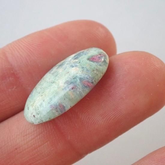 こちらは優しい緑色のフックサイトの中にルビーの結晶が入っているルビーインフックサイトのカボションカットルースとなります。