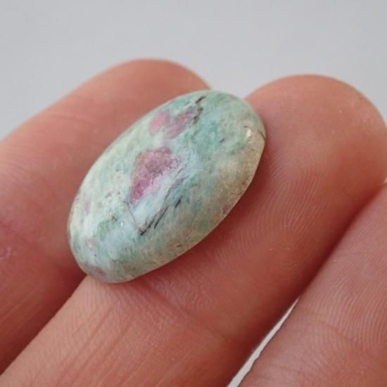 こちらは優しい緑色のフックサイトの中にルビーの結晶が入っているルビーインフックサイトのカボションカットルースとなります。