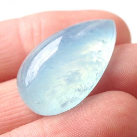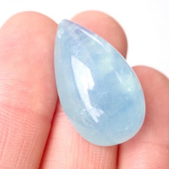 こちらは瑞々しい水色が美しく大粒のアクアマリン、カボションカットのルースになります。一粒で主役級の美しさなのでシンプルな装いもカラフルでゴージャスな装いもどちらも似合うと思っています。また、大きさもありますので手元で愛でるにもちょうど良いサイズ感と重量感です。