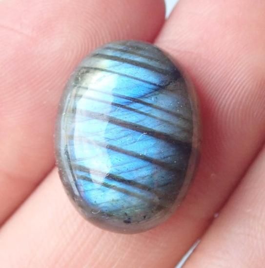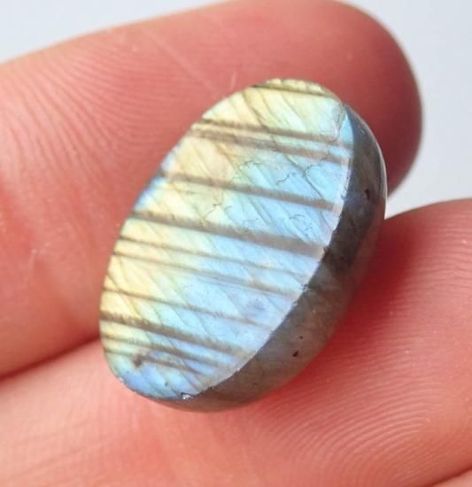 グレーのような黒のような地に目を引く青緑のシラーが閃光を放つように輝きはラブラドレッセンスと言われています。