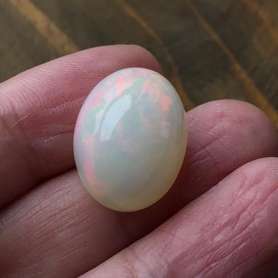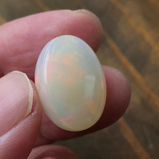こちらはエチオピアオパールの中でもなかなか入手困難な特大サイズのルースとなります。乳白色の中に美しく輝く遊色は圧巻です。お写真は自然光で撮影していますが、直射日光や光の強い場所ではより一層輝きます。最後の写真はルースの裏面となります。