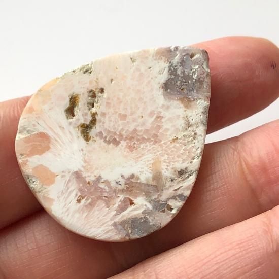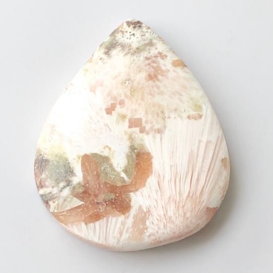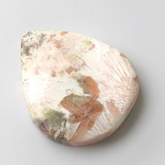 こちらはスコレサイトのルースになります。スコレサイトは一般的に白色ですが、今年はオレンジ色の鉱物が混ざったルースに出会う事ができたためお迎えしました。スコレサイトについて調べてみると、スティルバイトというオレンジの鉱物が混ざり合う事があるらしく、色合いからしても今回のスコレサイトはスティルバイトが混ざった原石からカット・研磨されたルースではないかと思います。