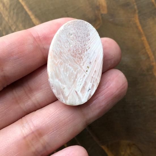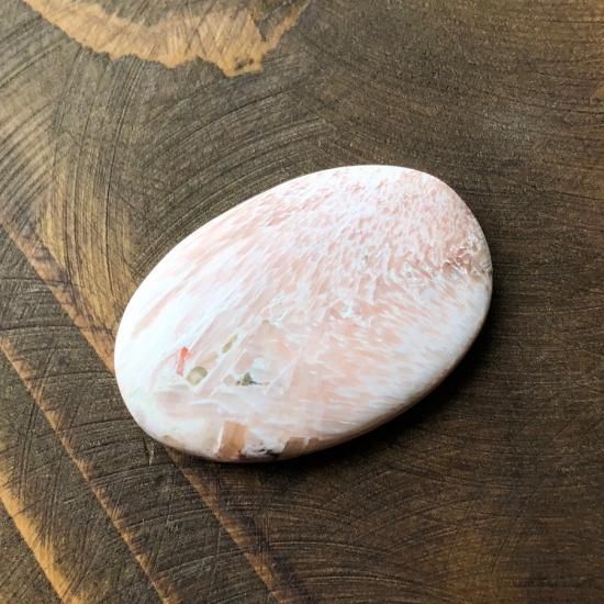 こちらはスコレサイトのルースになります。スコレサイトは一般的に白色ですが、今年はオレンジ色の鉱物が混ざったルースに出会う事ができたためお迎えしました。スコレサイトについて調べてみると、スティルバイトというオレンジの鉱物が混ざり合う事があるらしく、色合いからしても今回のスコレサイトはスティルバイトが混ざった原石からカット・研磨されたルースではないかと思います。