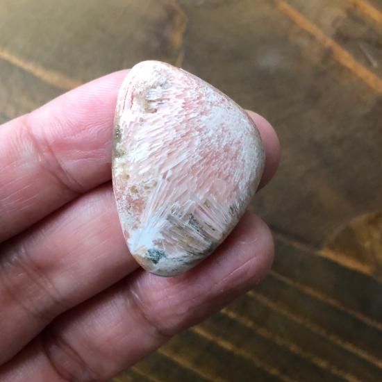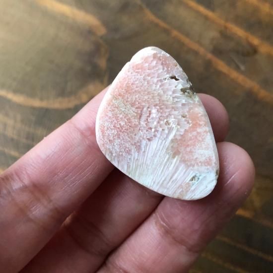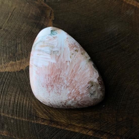 こちらはスコレサイトのルースになります。スコレサイトは一般的に白色ですが、今年はオレンジ色の鉱物が混ざったルースに出会う事ができたためお迎えしました。スコレサイトについて調べてみると、スティルバイトというオレンジの鉱物が混ざり合う事があるらしく、色合いからしても今回のスコレサイトはスティルバイトが混ざった原石からカット・研磨されたルースではないかと思います。