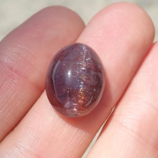 こちらはアイオライトにサンストーンの輝きが美しいカボションとなっている上、さらに太陽の下で見る事でキャッツアイの表情を見せてくれるとても面白みのある珍しいピースになっています。