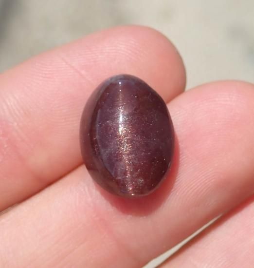 こちらはアイオライトにサンストーンの輝きが美しいカボションとなっている上、さらに太陽の下で見る事でキャッツアイの表情を見せてくれるとても面白みのある珍しいピースになっています。