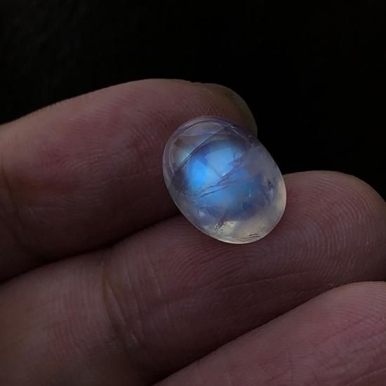 レインボームーンストーンの特性として背景が暗めな時にもっとも青い色を発揮するのですが、手の上に乗せるともう少しだけ優しい光かたに変わります。そんな違いも是非お手元で楽しんで頂けたらと思います。