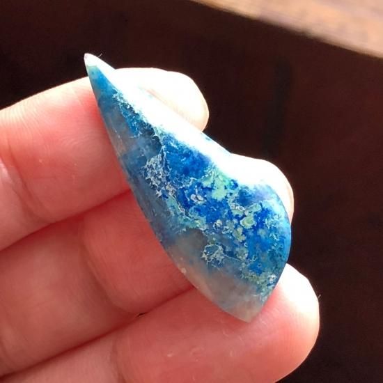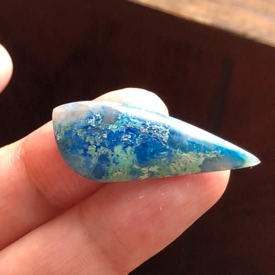クリソコラをベースにアズライト、シャッタカイト、マラカイト、アズライト、ダイオプテーズなど実にさまざまな種類の鉱物が含まれています。もともとのベースが青や水色の石に、それらが混ざりあって石英化しているため、透明感を感じられる美しい癒しの雰囲気ですね^^
