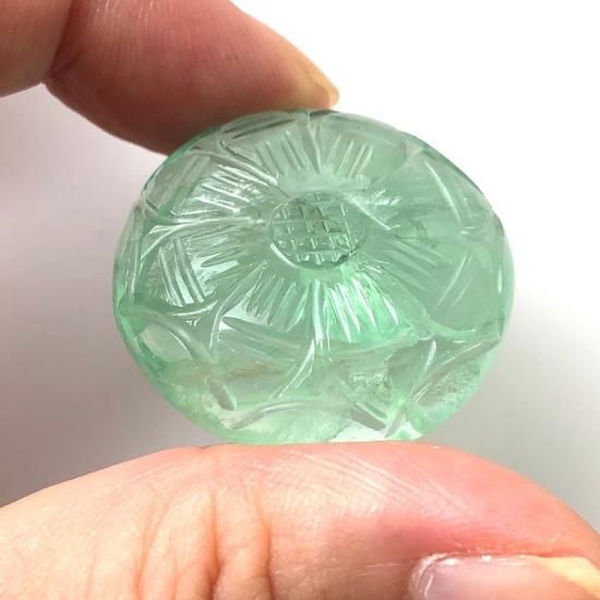 グリーンフローライトのカービングカボションカットになります。今回オンラインショップに掲載しているこちらは大きさもあったりオーダーでカービングを入れて頂いている為、前回入荷の時により比べ価格が上がっているのですが、今回お手頃価格で掲載しております。