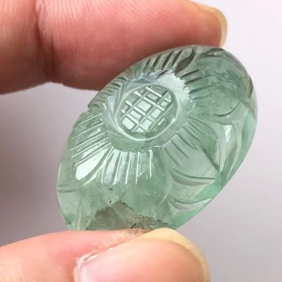 グリーンフローライトのカービングカボションカットになります。今回オンラインショップに掲載しているこちらは大きさもあったりオーダーでカービングを入れて頂いている為、前回入荷の時により比べ価格が上がっているのですが、今回お手頃価格で掲載しております。