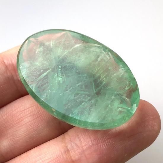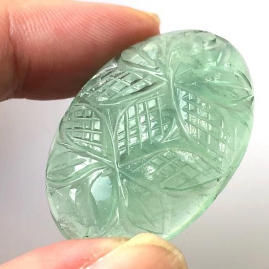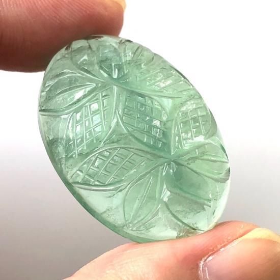 グリーンフローライトのカービングカボションカットになります。今回オンラインショップに掲載しているこちらは大きさもあったりオーダーでカービングを入れて頂いている為、前回入荷の時により比べ価格が上がっているのですが、今回お手頃価格で掲載しております。