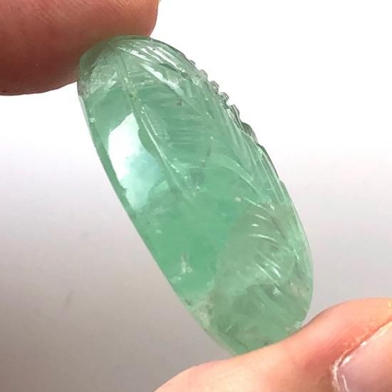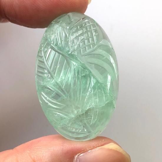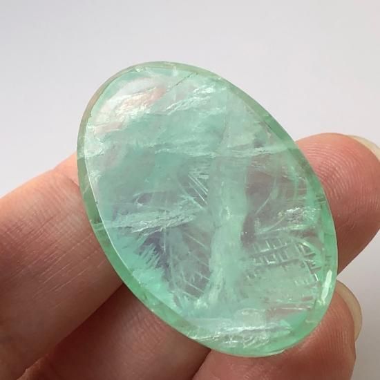 グリーンフローライトのカービングカボションカットになります。今回オンラインショップに掲載しているこちらは大きさもあったりオーダーでカービングを入れて頂いている為、前回入荷の時により比べ価格が上がっているのですが、今回お手頃価格で掲載しております。