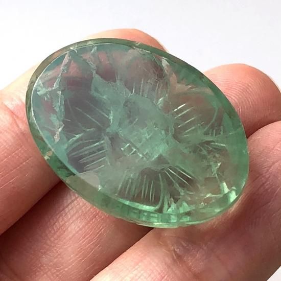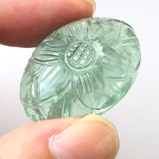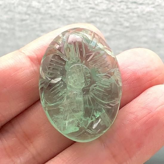 グリーンフローライトのカービングカボションカットになります。今回オンラインショップに掲載しているこちらは大きさもあったりオーダーでカービングを入れて頂いている為、前回入荷の時により比べ価格が上がっているのですが、今回お手頃価格で掲載しております。