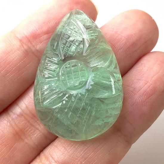 グリーンフローライトのカービングカボションカットになります。今回オンラインショップに掲載しているこちらは大きさもあったりオーダーでカービングを入れて頂いている為、前回入荷の時により比べ価格が上がっているのですが、今回お手頃価格で掲載しております。