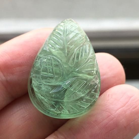 グリーンフローライトのカービングカボションカットになります。今回オンラインショップに掲載しているこちらは大きさもあったりオーダーでカービングを入れて頂いている為、前回入荷の時により比べ価格が上がっているのですが、今回お手頃価格で掲載しております。