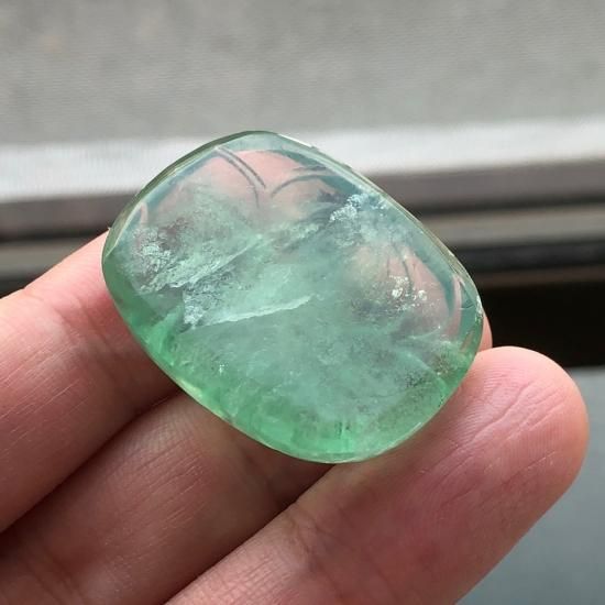グリーンフローライトのカービングカボションカットになります。今回オンラインショップに掲載しているこちらは大きさもあったりオーダーでカービングを入れて頂いている為、前回入荷の時により比べ価格が上がっているのですが、今回お手頃価格で掲載しております。