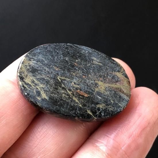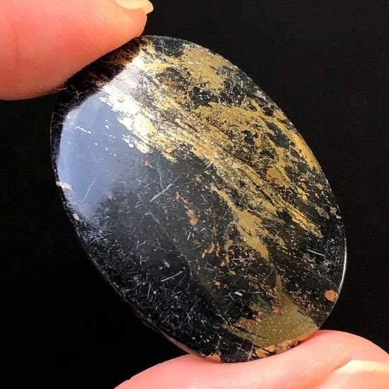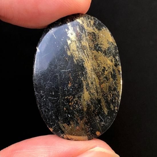 真っ黒な黒地のマグネサイトにゴールドカラーのパイライトが混じり合い、とてもスタイリッシュな雰囲気のヒーラーズゴールドのルースです。