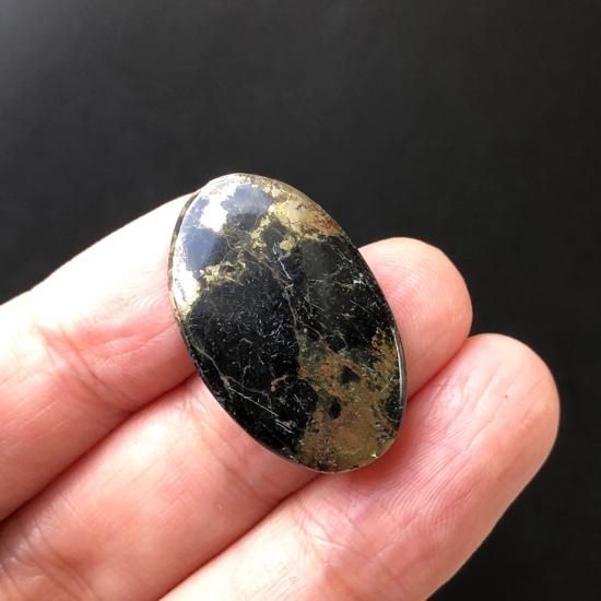 真っ黒な黒地のマグネサイトにゴールドカラーのパイライトが混じり合い、とてもスタイリッシュな雰囲気のヒーラーズゴールドのルースです。