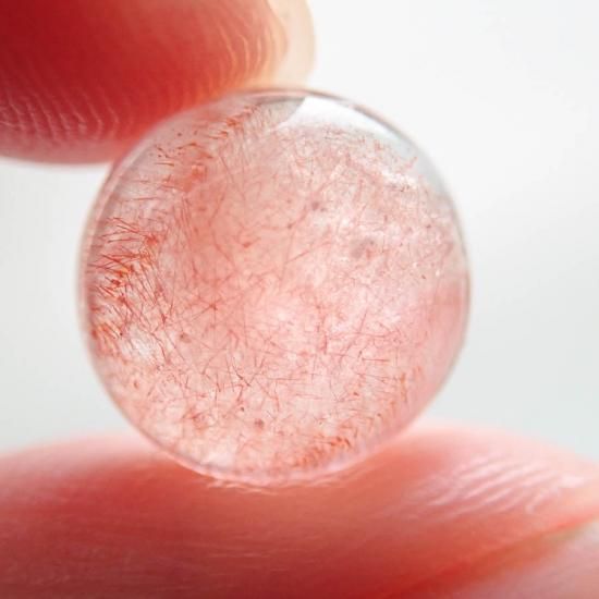 ストロベリークォーツ自体に出会うのがなかなか難しい現状なのですが、水晶の透明度が高く、また針鉄鋼の密度が高いものに関しては本当に見かけません。ましてやカボションのみの状態ですとほとんどないのではないでしょうか…。