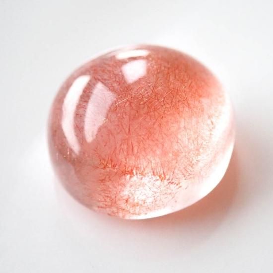 ストロベリークォーツ自体に出会うのがなかなか難しい現状なのですが、水晶の透明度が高く、また針鉄鋼の密度が高いものに関しては本当に見かけません。ましてやカボションのみの状態ですとほとんどないのではないでしょうか…。