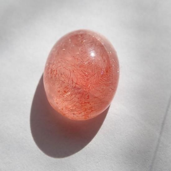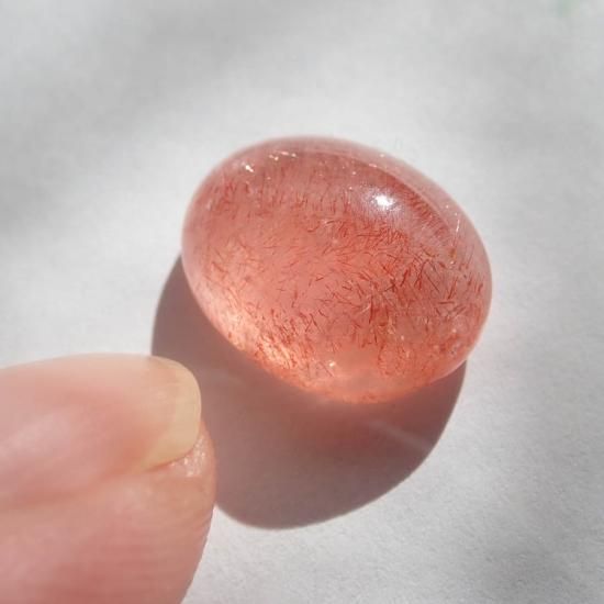 ストロベリークォーツ自体に出会うのがなかなか難しい現状なのですが、水晶の透明度が高く、また針鉄鋼の密度が高いものに関しては本当に見かけません。ましてやカボションのみの状態ですとほとんどないのではないでしょうか…。