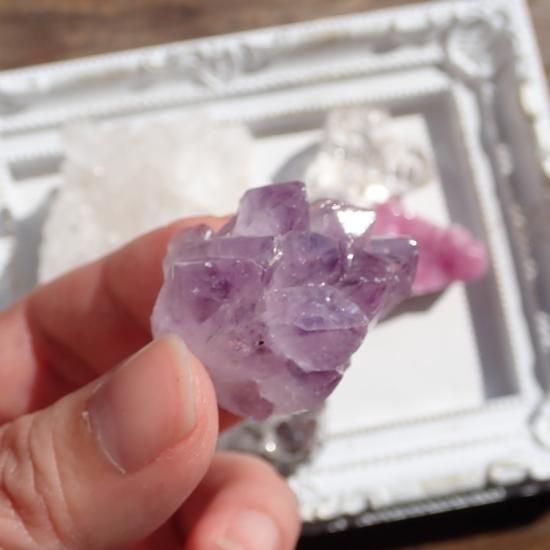 アメジスの小さなクラスター。全てではないのですが、中にはカコクセナイトや虹が入っている結晶もございます^^