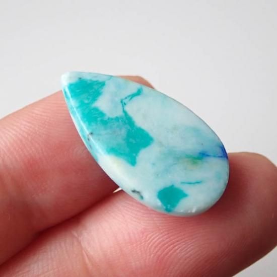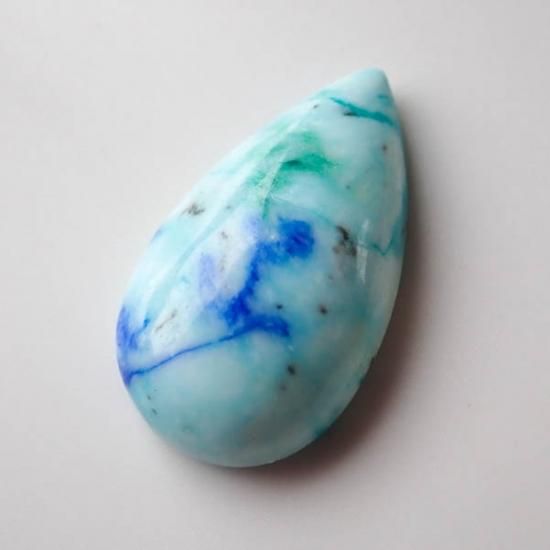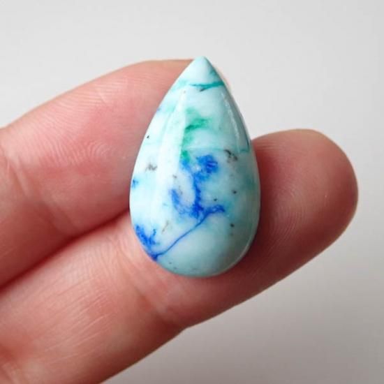 最初はターコイズインラピスラズリやアズライトインターコイズなどと呼ばれていましたが、鑑別の結果としては真っ青な部分はアズライト、明るい水色はクリソコラとの事でした。稀に緑の部分があるルースがあるのですが、そちらはマラカイトかと思われます。