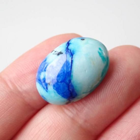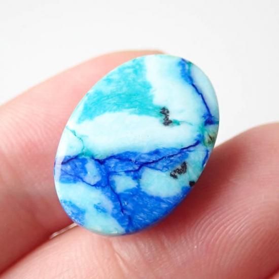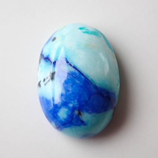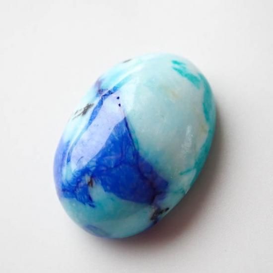 最初はターコイズインラピスラズリやアズライトインターコイズなどと呼ばれていましたが、鑑別の結果としては真っ青な部分はアズライト、明るい水色はクリソコラとの事でした。稀に緑の部分があるルースがあるのですが、そちらはマラカイトかと思われます。